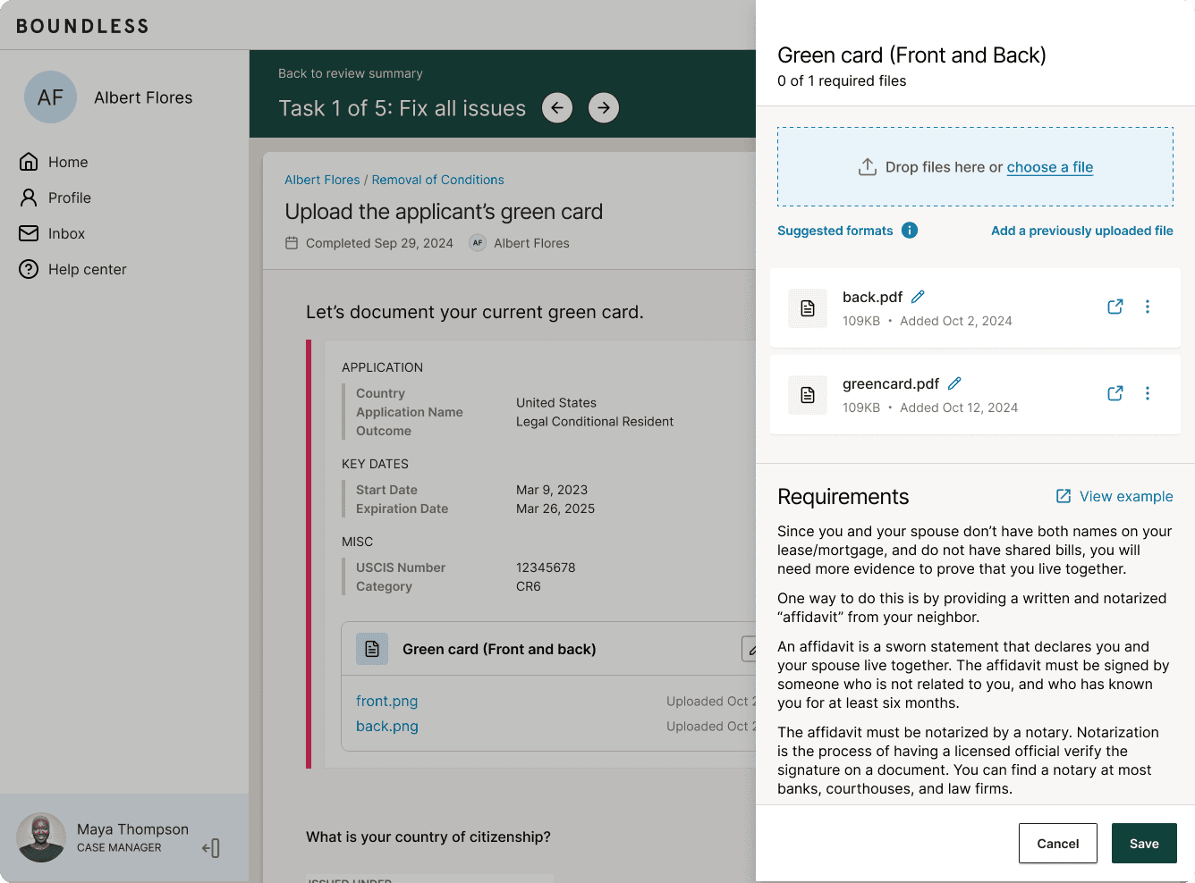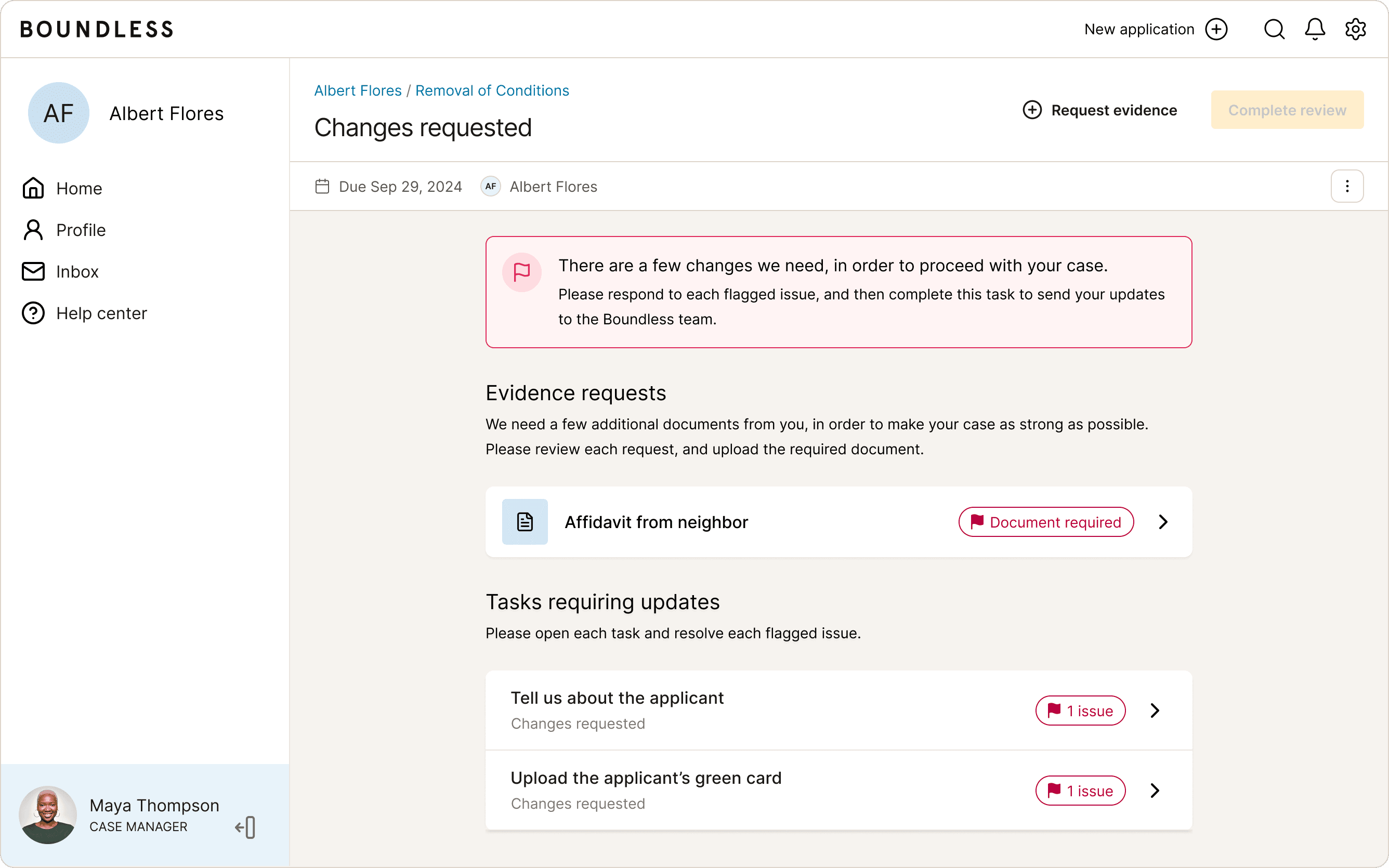 A member of the case review team reviews each task, and can flag issues that must be fixed. They can also add new evidence requests, if additional documents are required