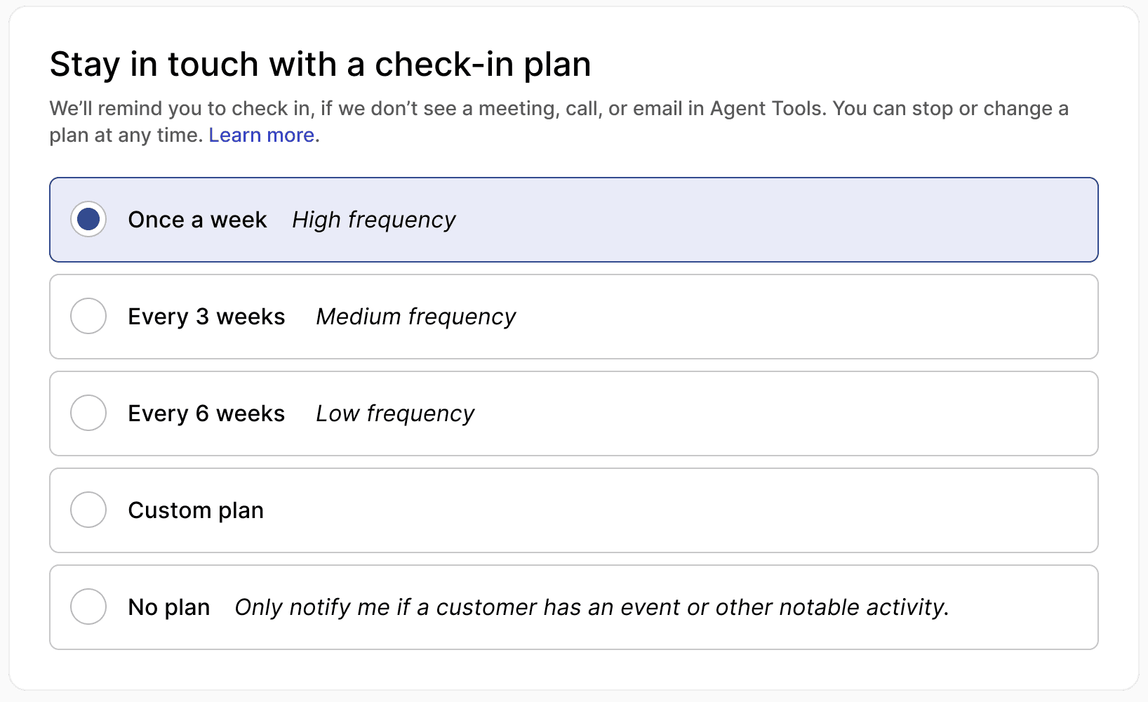 Next, we built customizable check-in plans that would help an agent stay in touch over the long term.