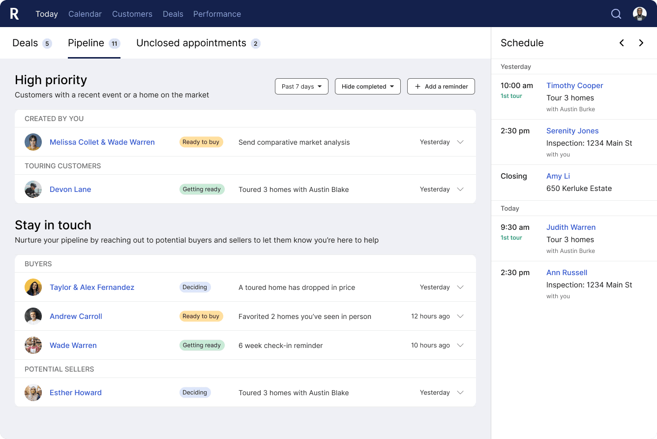Real estate agents juggle relationships with hundreds of customers. This is especially true for Redfin, where they meet customers who schedule tours via the website and app. Buyer timelines vary wildly: the median search is 8 weeks, but 32% take longer than 6 months. Agents need to work hard to make sure they're top of mind for a customer when they're finally ready to buy.